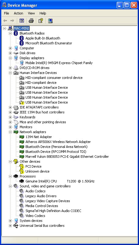 デバイスマネージャー。いくつか不明のデバイスがあります。これは、ドライバーが無いと言うことですね。基本動作は、問題ないですが、それぞれ何でしょう? 一番目立つ問題は、ワイヤレスLANが機能しないことですね。iMacでは動くらしいですが、それはWindowsマシンでも使用されているワイヤレスチップを使用しているためでしょう。そういえば、Intel iMacではMacではこれまで使われていなかった802.11aにも対応しているとのこと。