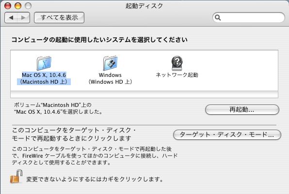 なんと、Windows側にもあった起動ディスクの選択。これはBootCamp オリジナル? しっかり、OS Xのアイコンが表示されていたり、Targetモードの選択まであります。2006年04月08日