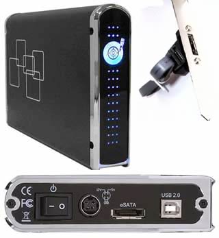 今後、外付けハードドライブのインターフェースの本命となっていくと思われるのがeSATA接続のドライブです。eSATAとUSB 2.0インターフェースを備えた外付けケースと、500GBドライブ内蔵モデルの取り扱いを開始しました。
