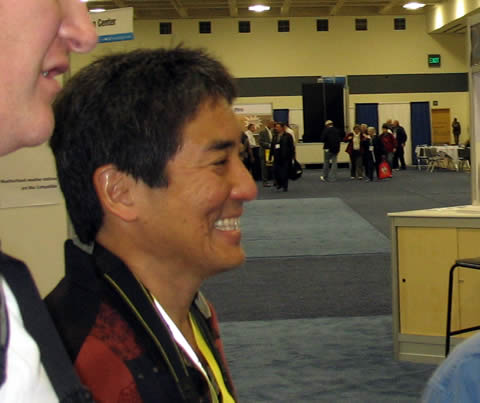 さて、そのパーティーのスペシャルゲストが、Mac エバンジェリストで有名なガイ・カワサキ氏。事前に聞いていなかったので、本人が目の前にいてビックリ。彼の著書「Reality Check」にサインをしてもらい、ガッチリ握手をしてもらいました。私達が日本人と言うことで、彼も親近感を持ってくれたみたいです。翌日、展示会場でもお会いしました。(写真はその時のもの)