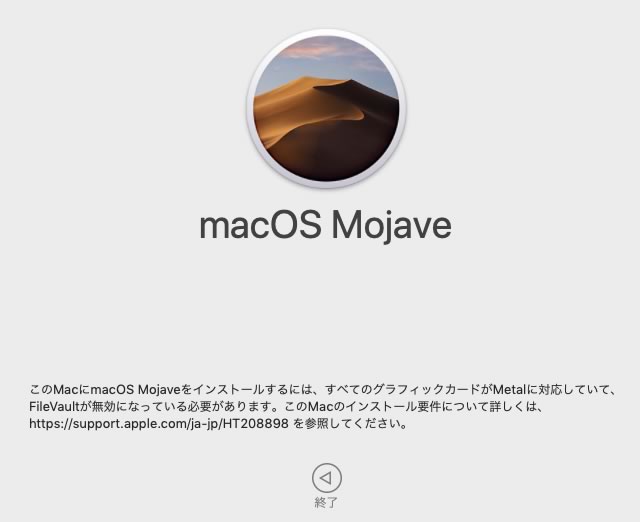 「このMacにmacOS Mojaveをインストールすることは、すべてのグラフィックカードがMetalに対応していて、FileVaultが無効になっている必要があります。このMacのインストール要件について詳しくは、https://support.apple.com/en-us/HT208898を参照してください。」