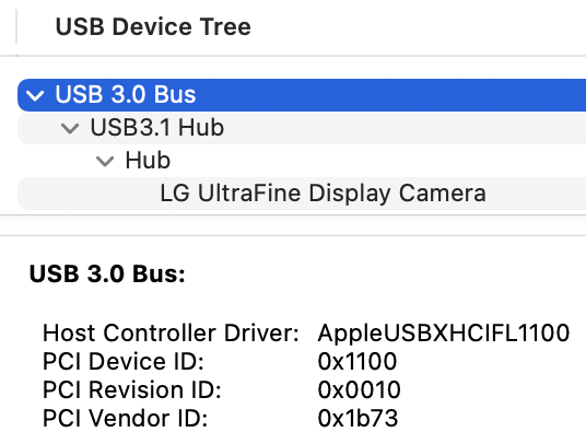 ドライバー名は、AppleUSBXHCIFL1100。LG UltraFine 5K DisplayにUSB 3.0のchipset FL1100が採用されているのでこうなります。これはMac Proに上記USBカードが装着されている場合も、全く同じ表示です。LG UltraFine 5K Displayは、今もApple Storeで販売されているくらいですから、当分の間はこのサポートが外れることは考えられないでしょう。