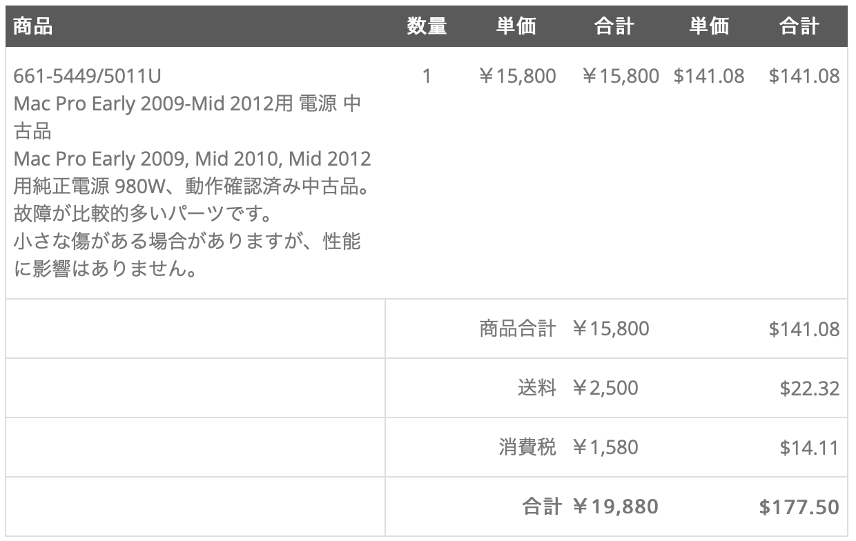この場合、クレジットカードやPaypalの場合は$177.50のお支払い、銀行振込や代引きの場合は19,880円のお支払いとなります。(代引きは別途手数料800円が加算)