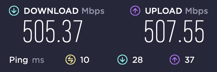 おお、500Mbpsに偽りなし!アップも早い。 以前も、ほとんどダウンすることがなかったので、信頼性の問題はないんじゃないかと思います。これで最近の不満は解消しそうです。