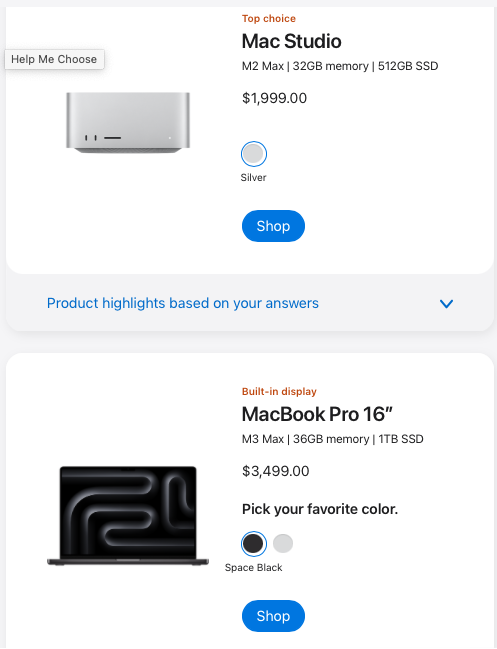 Apple があなたにとってベストなMacをお勧めするHelp me choose. のページを公開しています。現状、日本語対応はしていませんが、簡単な質問に答えるだけでベストなMacをお勧めしてくれます。
