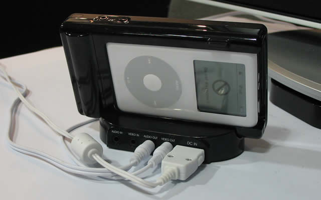 続いて、ビデオ非対応のiPodをビデオ対応にしてしまうと言うiSee 360。ビデオ非対応のiPodをビデオ対応にしてしまうなんて、すごい技術!と一瞬驚いたが、要はiPodはストレージとして使うだけ。モニタもiSee 360側のカラーLCDを使うわけで、iPod本体はモノクロでも関係なし。iSee 360とiPodの通信はUSBで行っているので、対応するiPodはドックコネクタ付きのUSB接続iPodとなる。つまり4G以降とmini、nanoである。