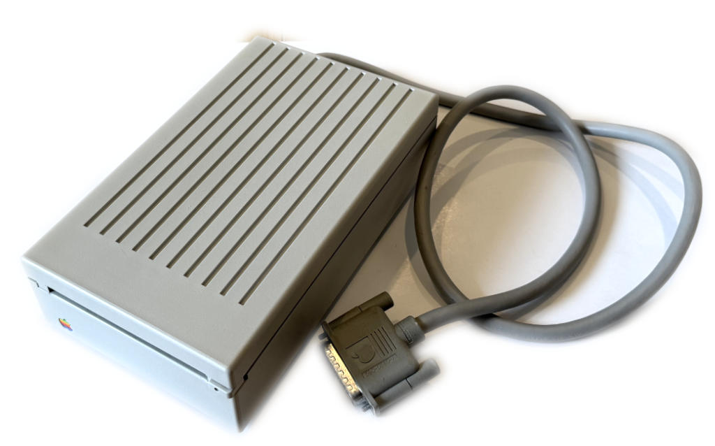 Macintosh Plus 以降、Apple IIgs, IIc plus で使用可能。外観程度は非常に良好、動作も良好です。このドライブは、イジェクトメカニズムのギアが固着または破損してイジェクト不良となることが多いのですが、このギアは交換済みですので安心してご利用いただけます。