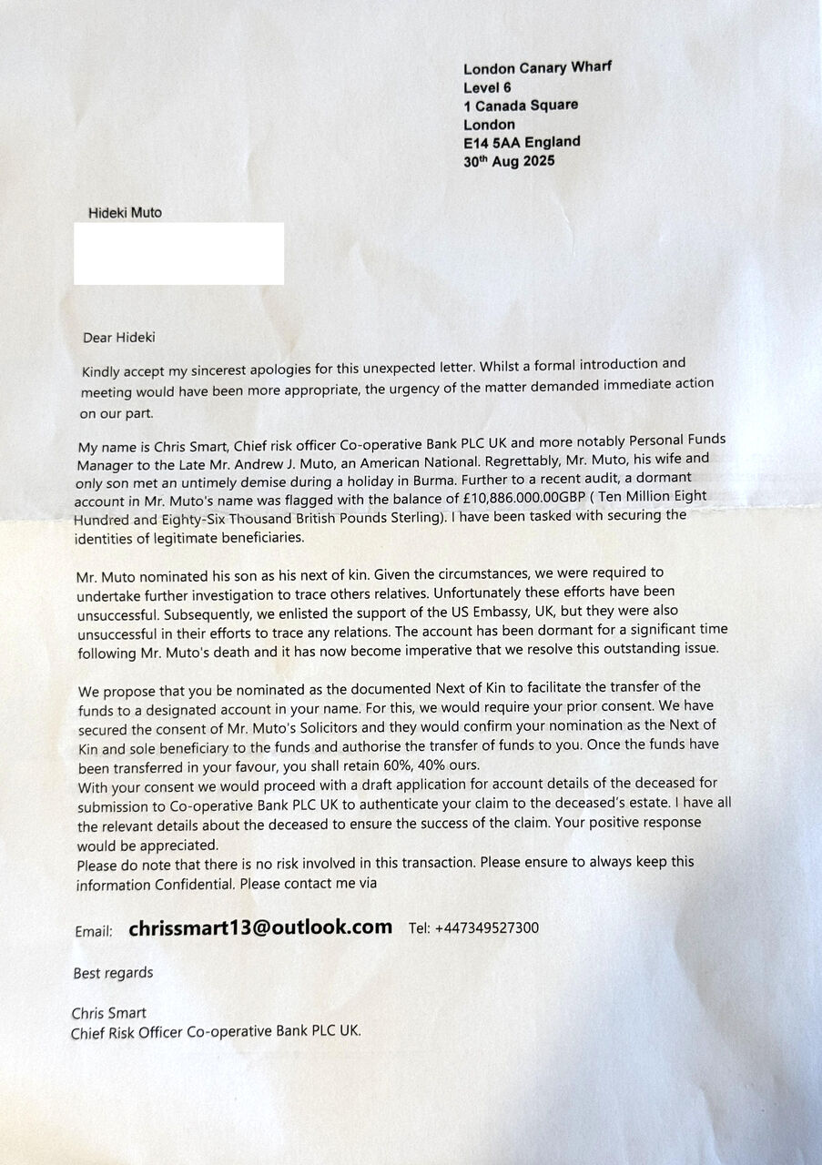 内容は、イギリスのMuto氏が23億円の遺産を残して亡くなった。Muto氏はイギリスに身寄りがなく、このままでは国に没収されてしまう。調査の結果、あなたはMuto氏の遠縁として認めらる可能性がある。没収される前に、至急23億円をあなたの口座に振り込みさせて欲しい。60%があなたの取り分で、40%が我々の取り分となります。